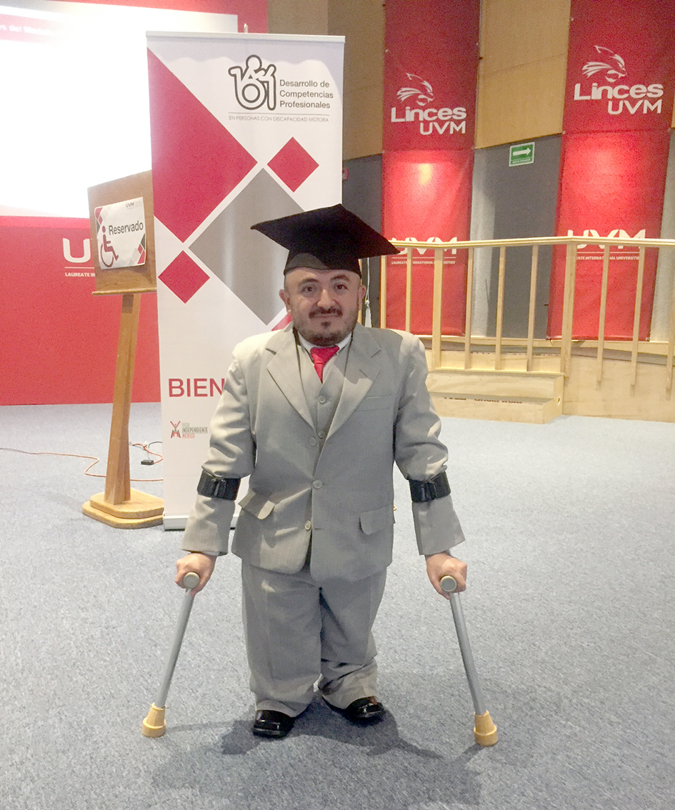 Alejandro Mejía, mide 1.17 de estatura, se apoya en sus bastones para caminar; diversos contratiempos y dificultades fueron los que el hoy graduado también venció para terminar el Diplomado y para trasladarse desde el Municipio de Tlalnepantla, Estado de México, al Campus Coyoacán de la UVM, ubicado en el Sur de esta Ciudad de México.