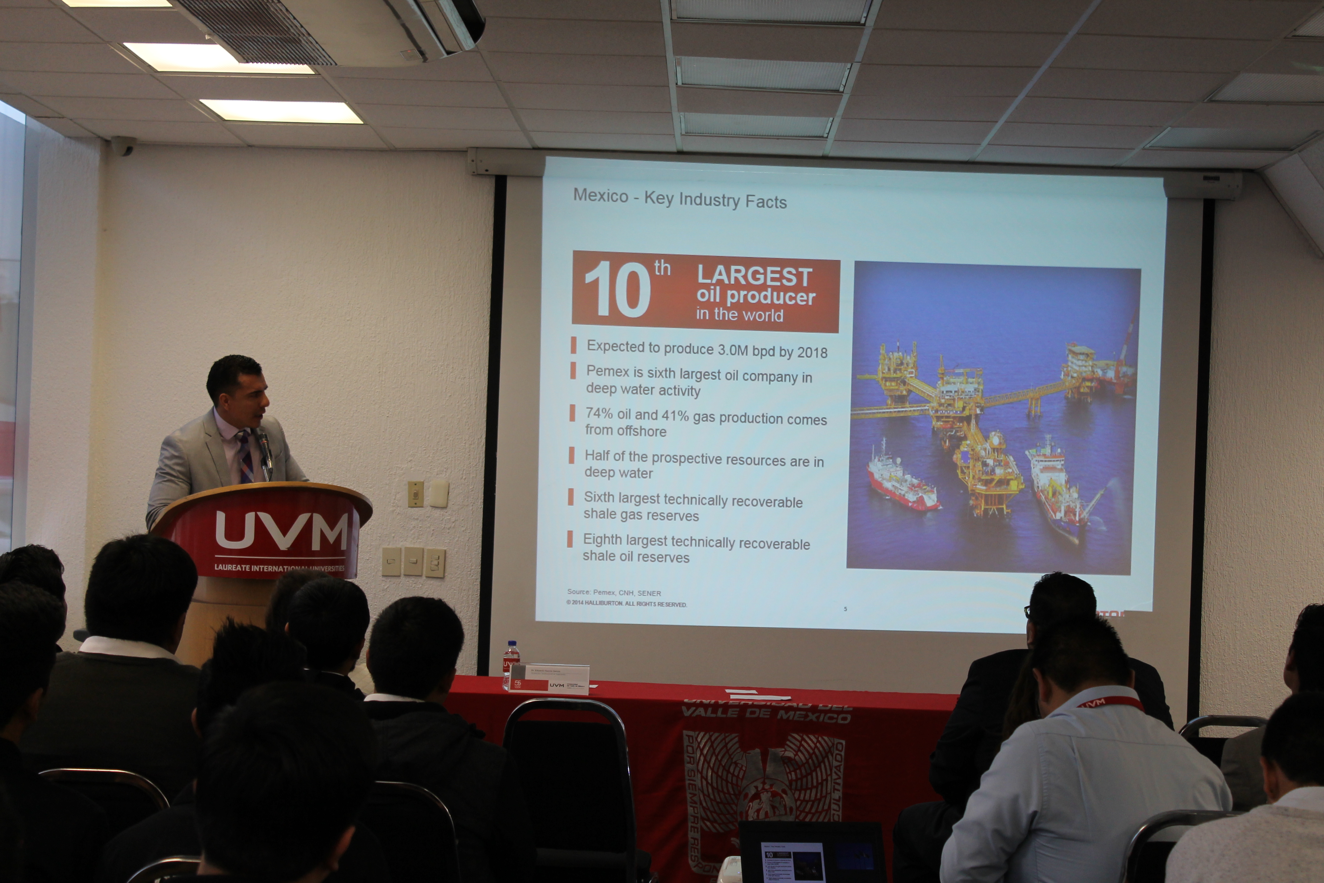 El Ingeniero Víctor M. Vera, Gerente de Cuentas Internacionales de la empresa Halliburton, habló del sector petrolero a la Primera Generación de estudiantes que cursan la Ingeniería en Petróleo y Gas en el Campus Coyoacán de la UVM. “México es de los principales productores de petróleo a nivel mundial, tiene bastante tiempo trabajando en la producción de este recurso.