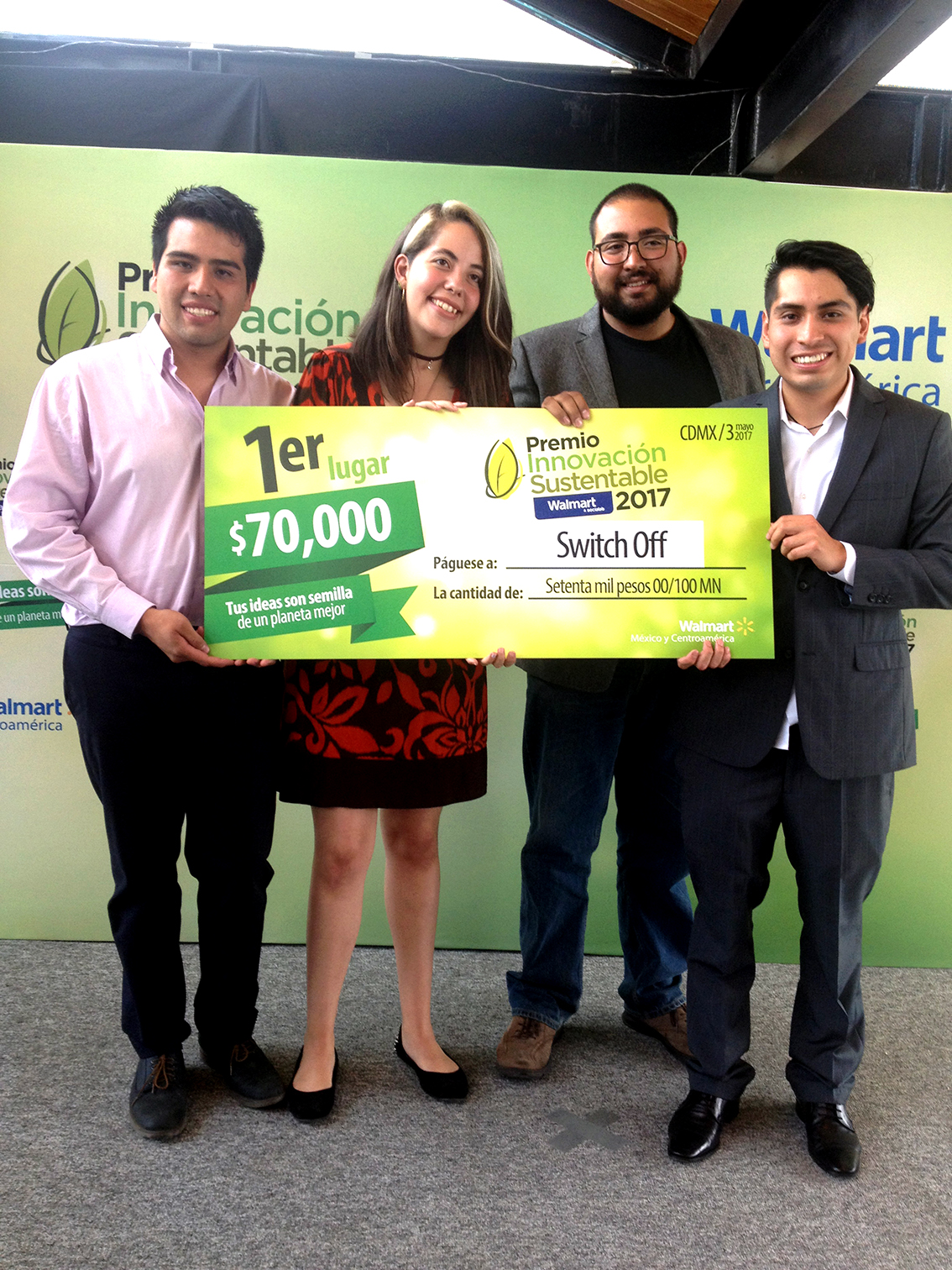 Lomas Verdes, Edomex., 18 de mayo de 2017.- Egresados de diversas carreras de la Universidad del Valle de México Campus Lomas Verdes, ganaron el Primer Lugar del Premio de Innovación Sustentable 2017, convocado por Walmart de México y Centroamérica en colaboración con Socialab, una incubadora de empresas sociales.