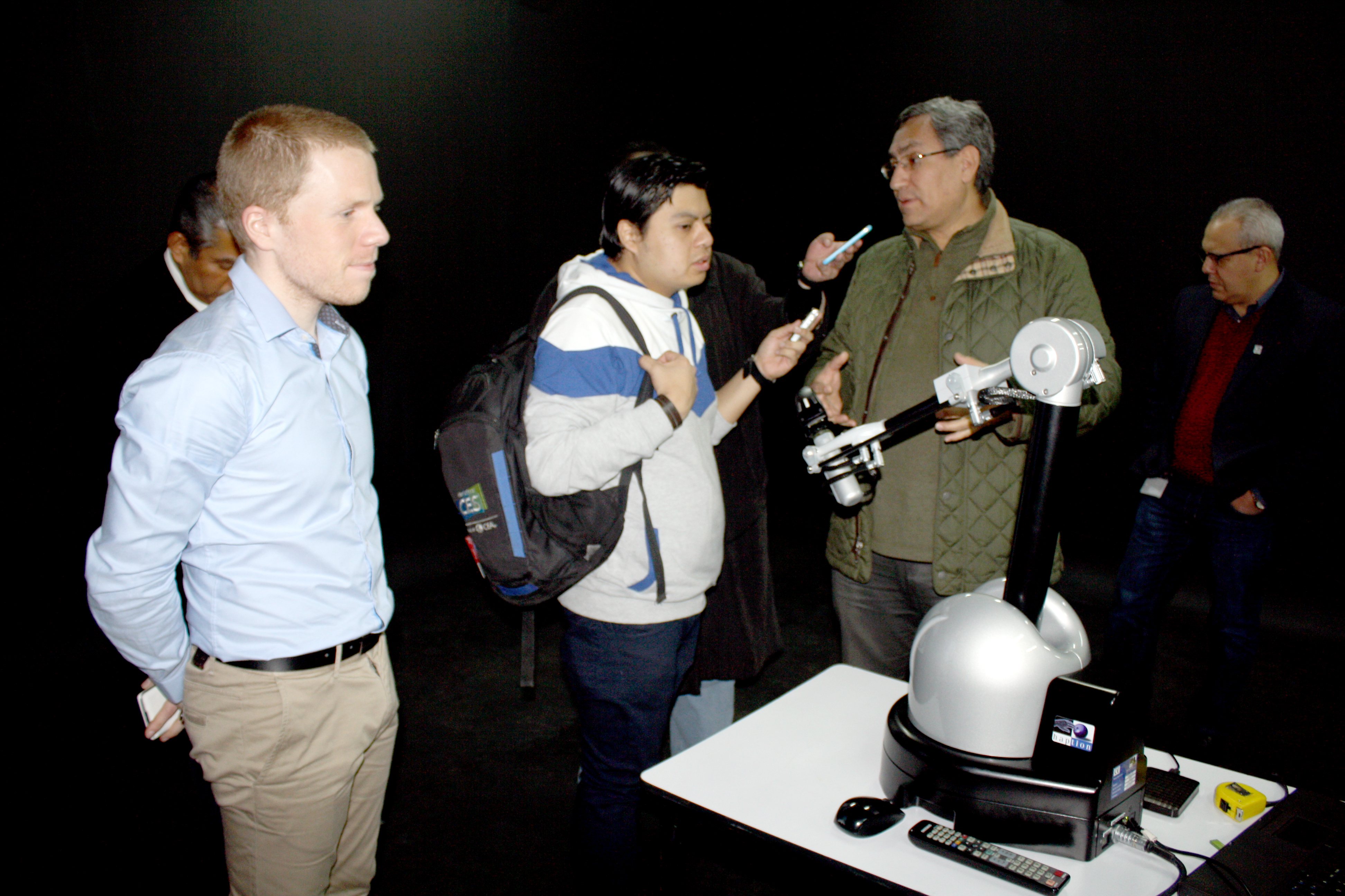 De acuerdo con el Doctor Eduardo García, las Interfaces Hápticas permiten al ser humano tocar, sentir y manipular objetos de manera simulada en entornos virtuales y sistemas teleoperados; “lo que ocurre en el mundo virtual, se refleja sensorialmente con interfaces hápticas, en este caso una extensión mecánica que captura movimiento, lo traduce en coordenadas que se reflejan en movimientos que pueden observarse en el mundo virtual a la vez que se generan movimientos mecánicos en la misma extensión que son percibidos por el usuario, tal cual como si estuviera interactuando con elementos y superficies de un entorno real”, comentó el Dr. García.