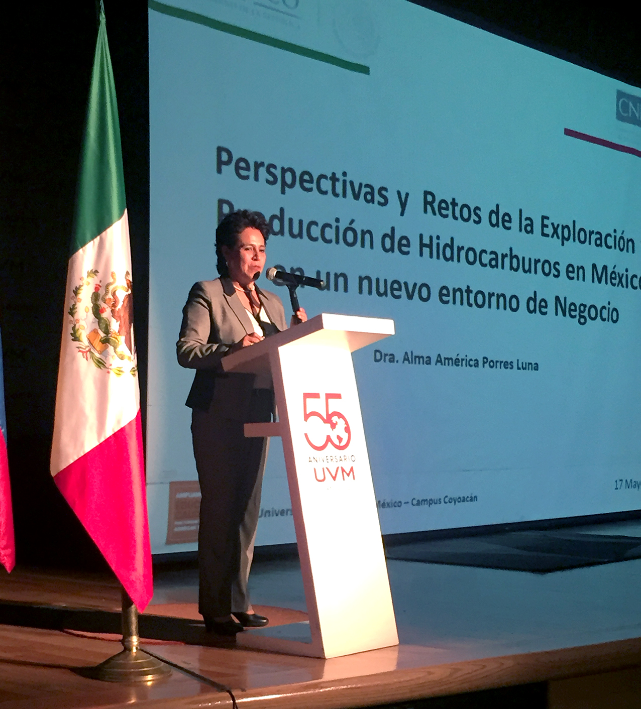 Ciudad de México, 17 de mayo de 2017.- Al hacer las conclusiones de su ponencia “Perspectivas y Retos de la Exploración y Producción de Hidrocarburos en México en un nuevo entorno de Negocio”, impartida a estudiantes de la Universidad del Valle de México Campus Coyoacán, por la Dra. Alma América Porres Luna, dijo que aunque ha habido avances significativos en el uso de las energías renovables y se prevé que en los próximos años éste se puede incrementar, la fósil es y será la principal fuente de energía.
